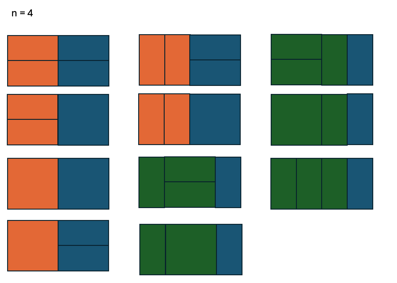 ์ด๋ก์ ๋ธ๋ก๋ค ๋ค์๋ 1x2 ๊ฐ ๋ถ์ด์ n = 4 ์ผ ๋์ ๊ฒฝ์ฐ์ ์๋ ์ด 11๊ฐ๋ก ๋ํ๋ผ ์ ์์ต๋๋ค.