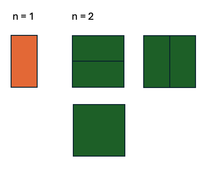 n - 1 ์ ๋ธ๋ก์๋ 1x2 ๋ก ์ด 1๊ฐ๋ฅผ ๋ถ์ด๋ฉด ๋๊ฒ ๋ค์.