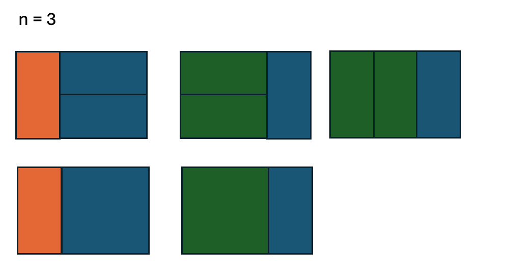 n = 2 ์ ๊ฒฝ์ฐ์ ์์ 1x2 ํ์ผ ํ๋๊ฐ ๋ถ์ฌ์ ธ์ ์ด 5๊ฐ์ง์ ๊ฒฝ์ฐ์ ์๊ฐ ๋์จ ๊ฑธ ์ ์ ์์ต๋๋ค.