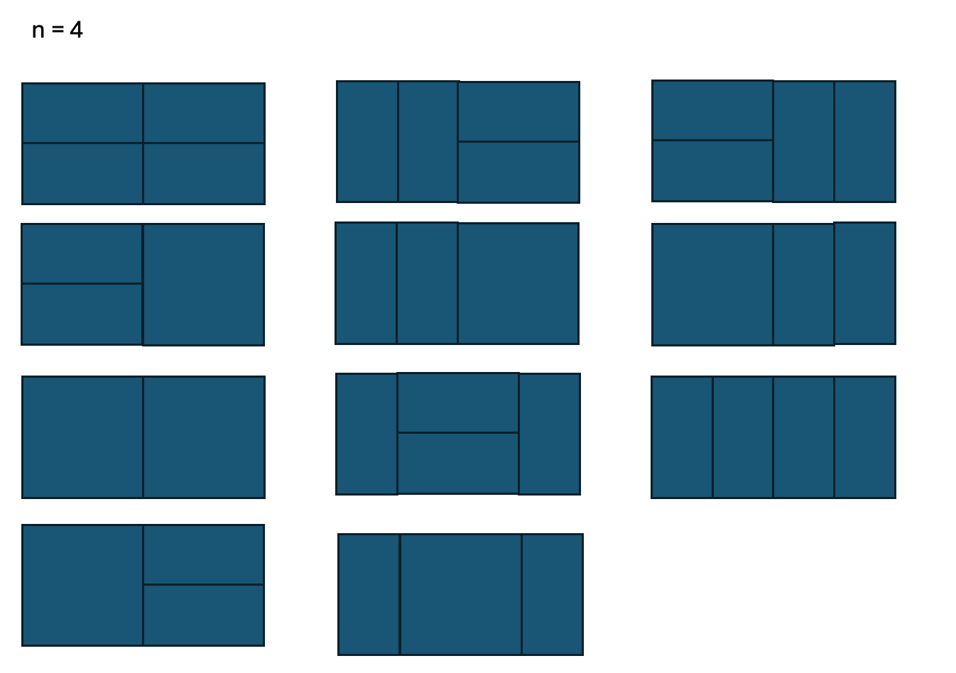 n = 2 ์ผ ๋๋ 1x2 2๊ฐ / 2x1 2๊ฐ / 2x2 1๊ฐ ๋ก ์ด 3๊ฐ์ง์ ๊ฒฝ์ฐ์ ์๋ก ๋ํ๋ผ ์ ์์ต๋๋ค.