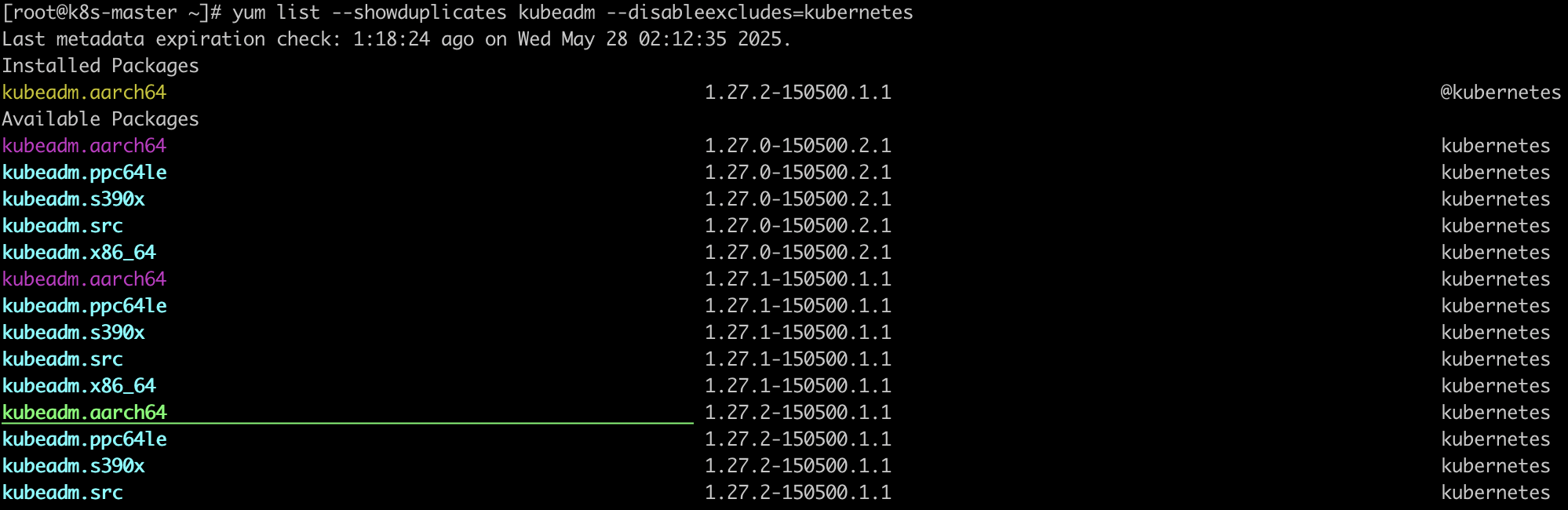 yum list --showduplicates kubeadm --disableexcludes=kubernetes