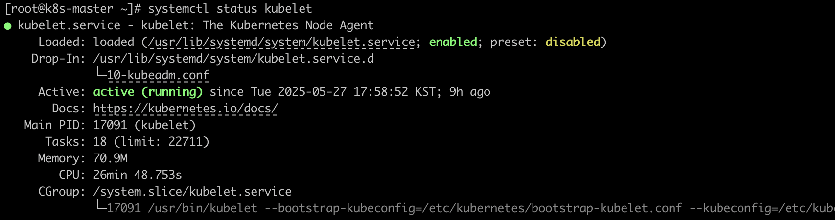 → kubelet 상태가 running 으로 정상 동작