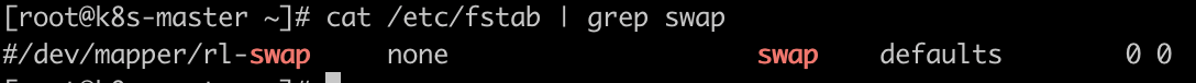 스왑 비활성화 확인 (script 적용 명령 : swapoff -a && sed -i '/ swap / s/^/#/' /etc/fstab)