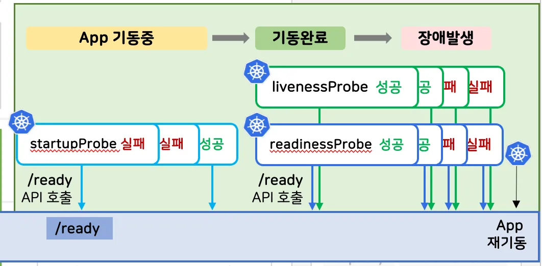 | startupProbe | "App 초기화가 끝났나?" 🙆♀️ (성공) : livenessProbe, readinessProbe 호출 🙅♀️ (실패) : 다시 호출 |