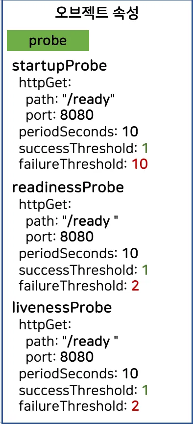 - startUpProbe, readinessProbe, livenessProbe 총 3개의 Probe 를 설정할 수 있다.