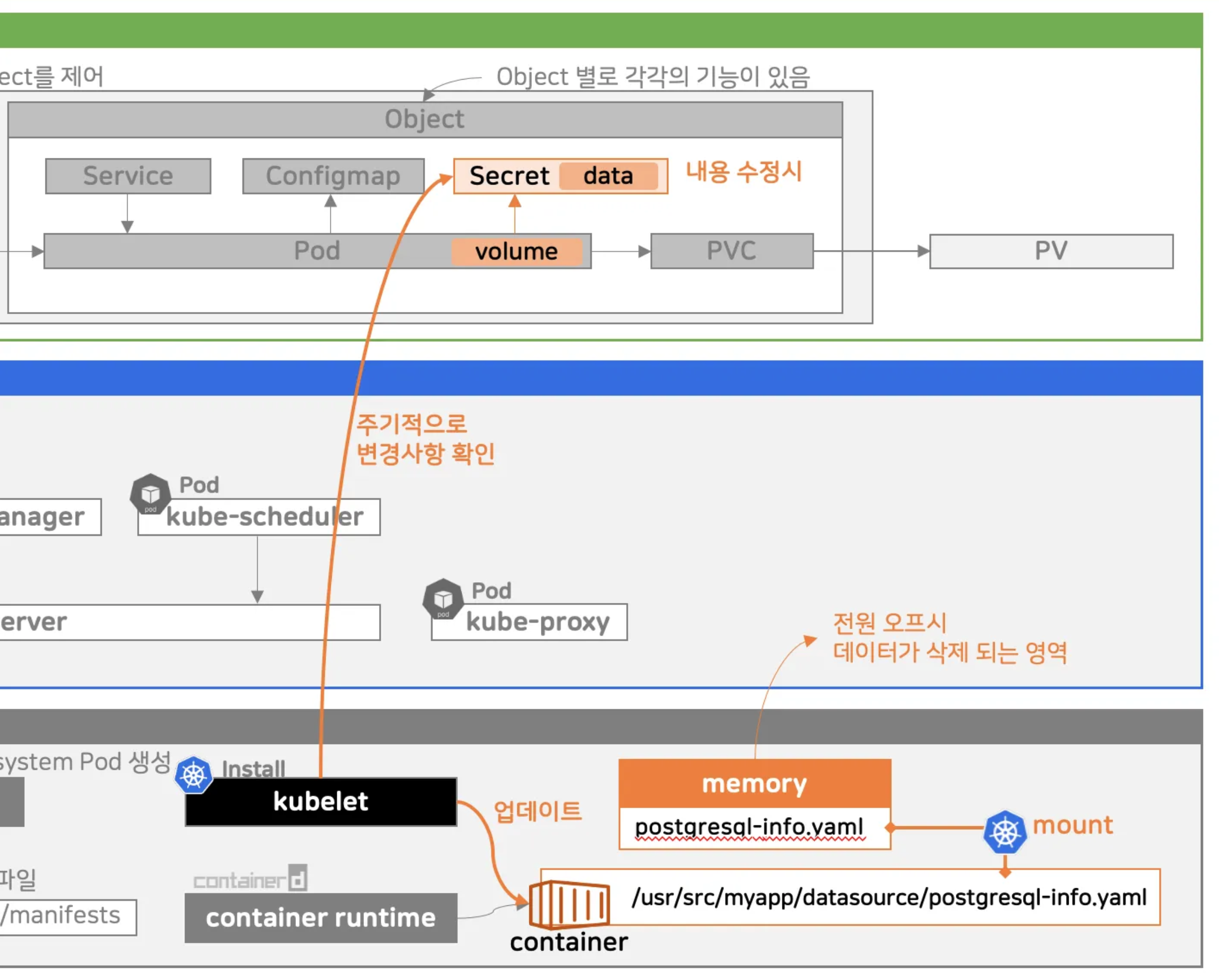 - 내용 수정시 바로 변경되지 않고, kubelet 이 주기적으로 체크를 하고 있다가 변경사항이 생기면 업데이트