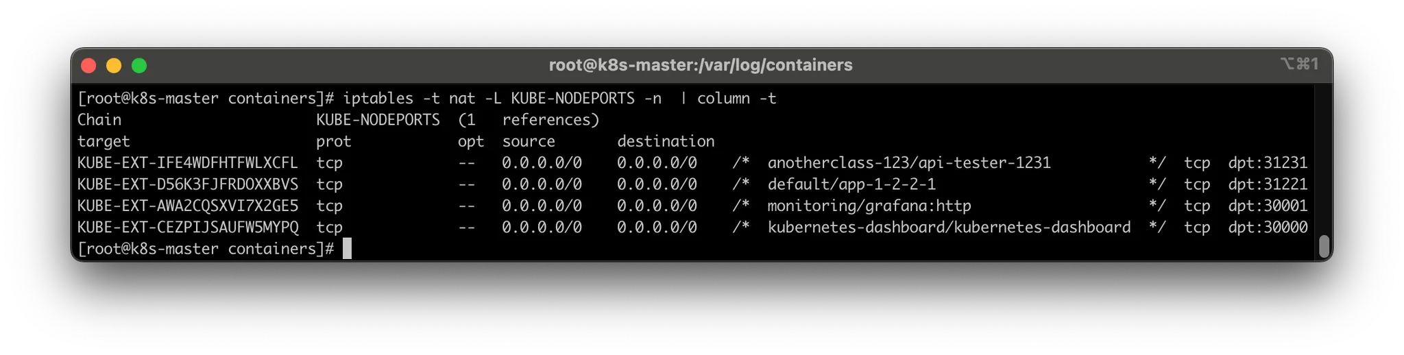 iptables -t nat -L KUBE-NODEPORTS -n | column -t
