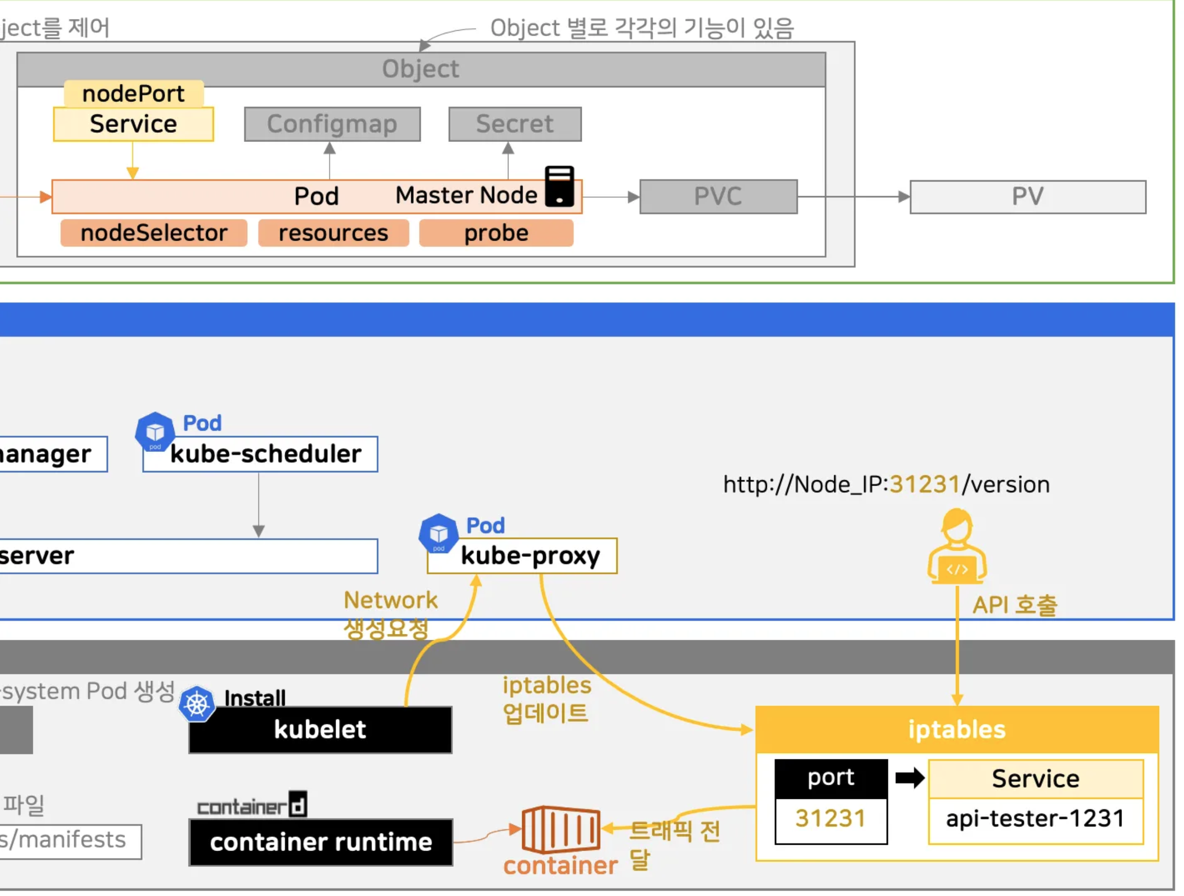 - 워커 노드는 클러스터에 조인되면, 자신만의 컴포넌트 영역이 생성
