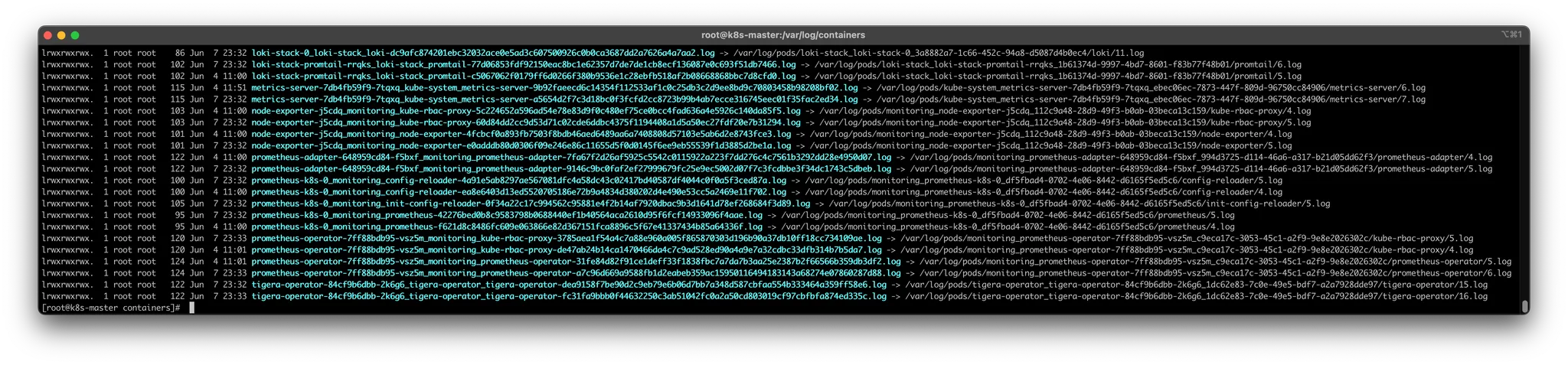 - /var/log/pods/ 에 마스터 노드 위에 올라가는 모든 Pod 들의 로그가 저장