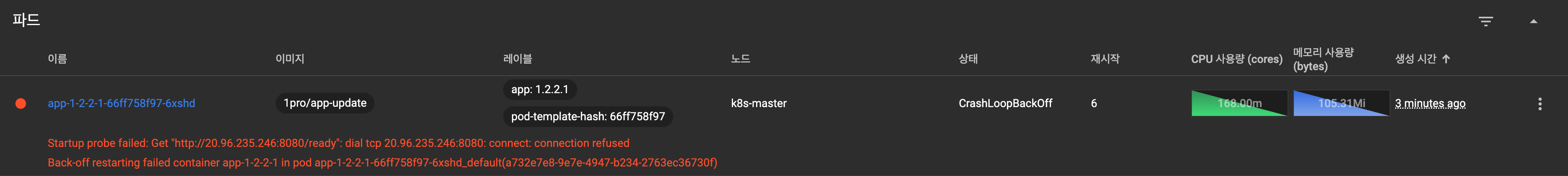 pod가 CrashLoopBackOff 상태로 계속 restart 됨
