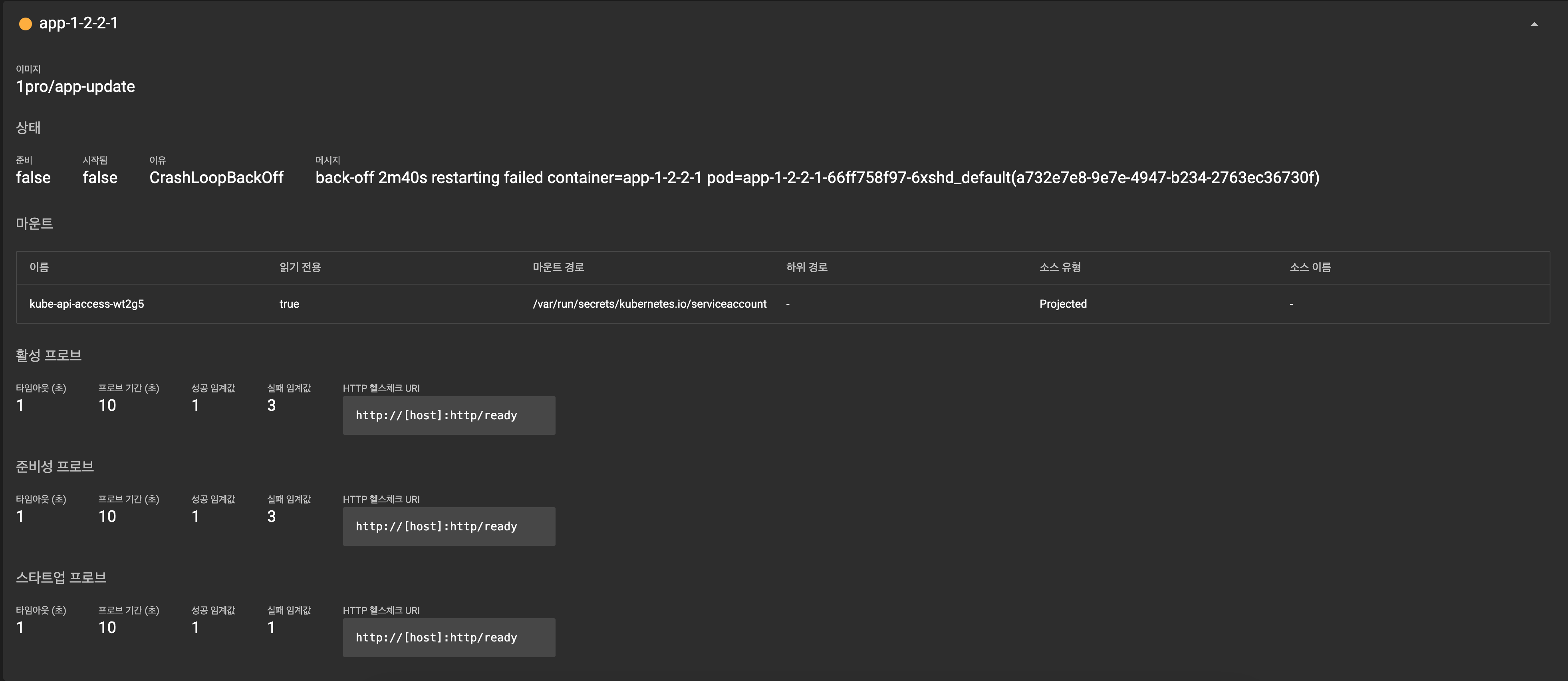 - 3분 후 앱 재시작 (liveness 실패)