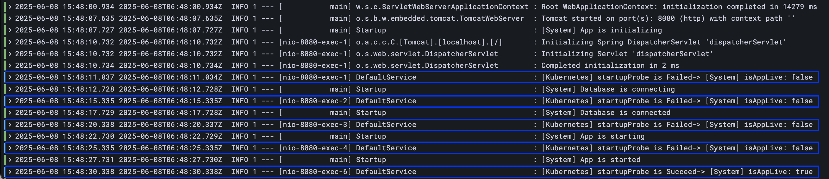 실제 Pod 의 로그를 보면 startUpProbe 가 4번 실패하고, 5번째에서 성공 !!