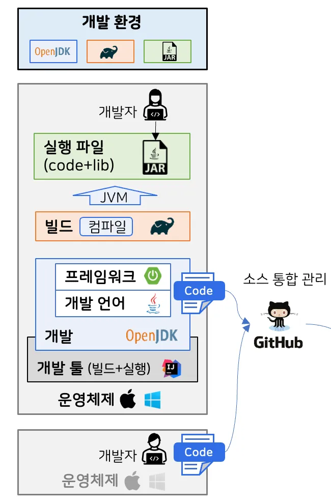 - Jar 파일이 만들어지는데, 이 파일이 OpenJDK 에 있는 JVM 위에서 실행 → 빌드하고, 파일을 실행시키는에 OpenJDK 가 항상 필요