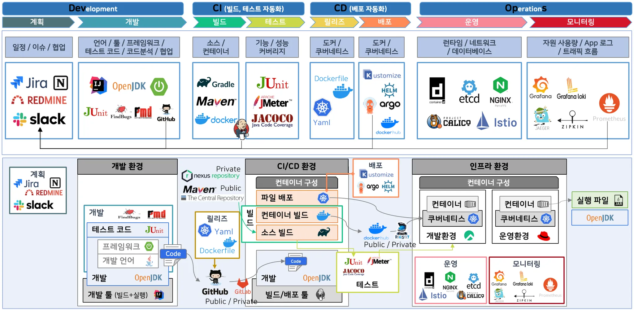 - 운영 : 런타임 / 네트워크 / 데이터베이스 : containerd, etcd, NGNIX, CALICO, Istio