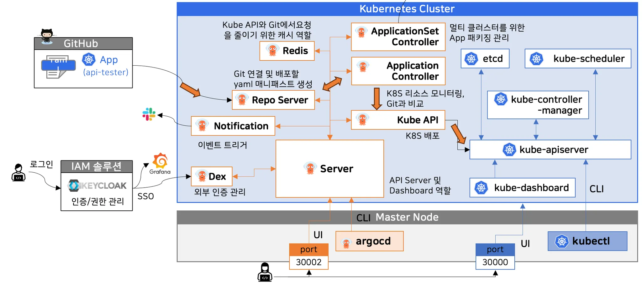 - Server : API Server 및 Dashboard 역할, Port를 통해 UI 로 접근하거나 argocd CLI 로 접근