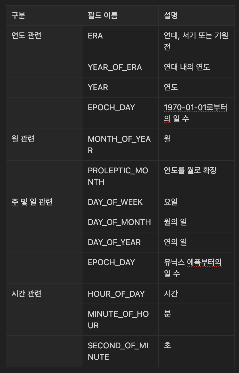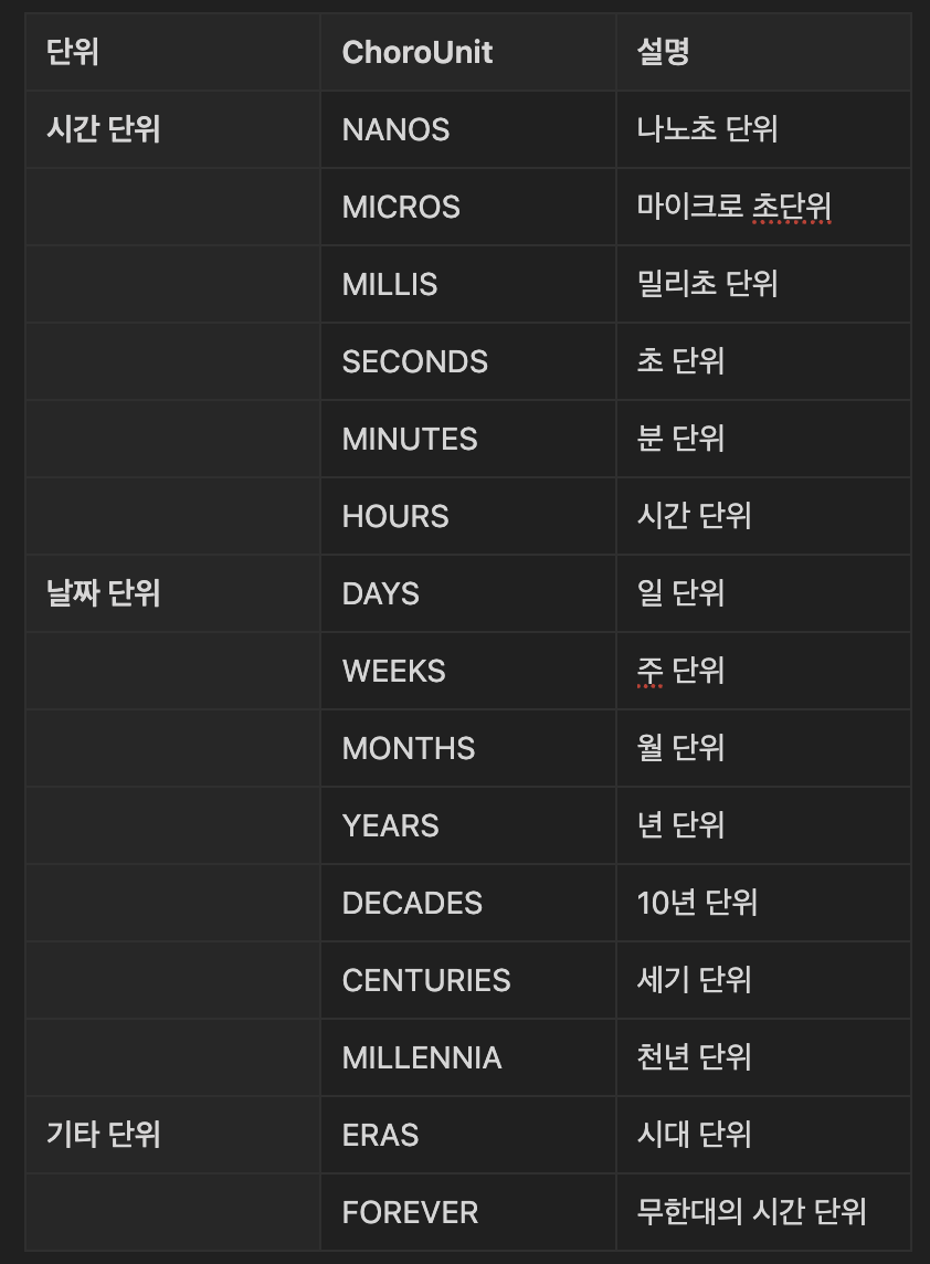 - 위와 같이 시간 단위 / 날짜 단위 / 기타 단위 별로 다양한 ChronoUnit 을 가진다.