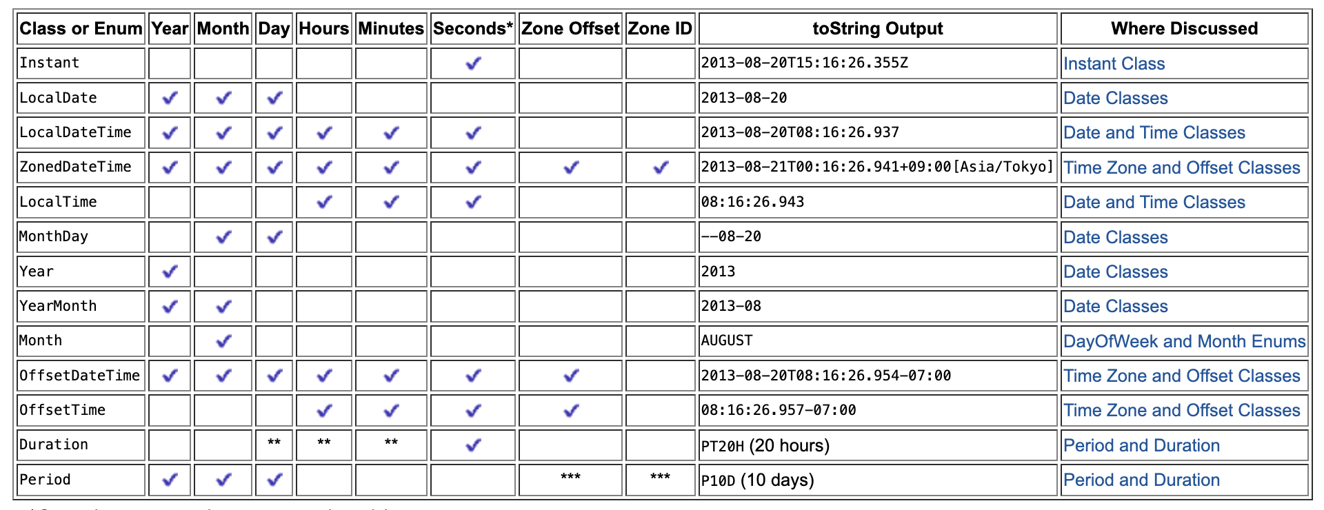 오라클의 자바 document 에 날짜와 시간 관련 라이브러리에 대해서 정리된 표가 있다