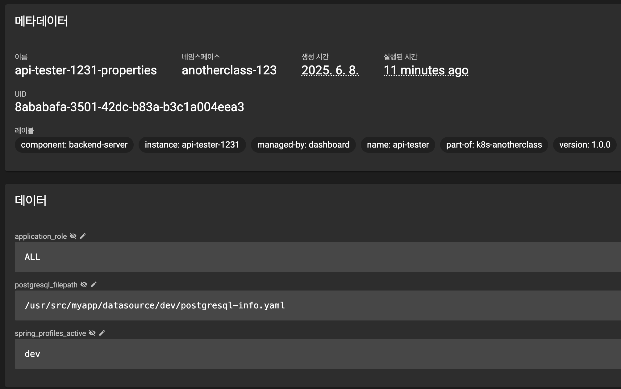- application_role, postgresql_filepath, spring_profiles_active ์ด ์ ์์ ์ผ๋ก ๋ค์ด๊ฐ ๊ฑธ ํ์ธ ๊ฐ๋ฅ