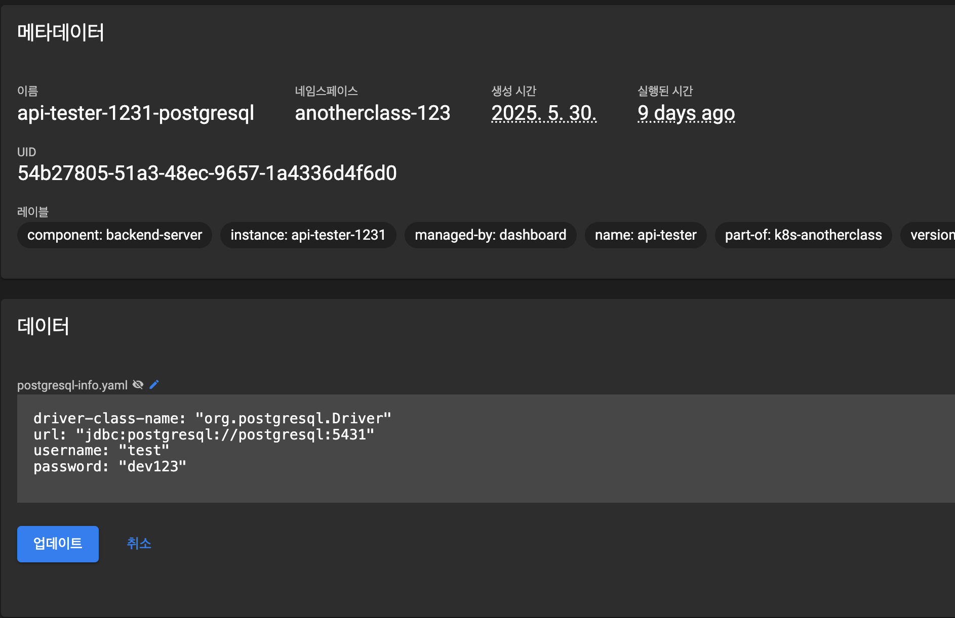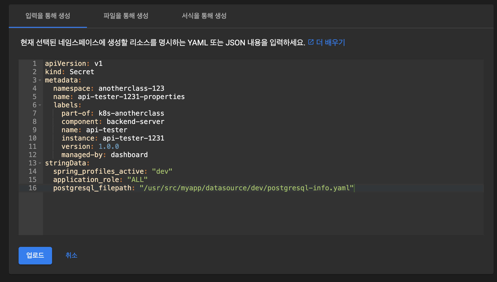 - application_role, postgresql_filepath, spring_profiles_active ๋ฅผ Secret ์ ๋ฐ์ดํฐ๊ฐ ๋ค์ด๊ฐ๋๋ก ์์ฑํด๋ณด๊ธฐ