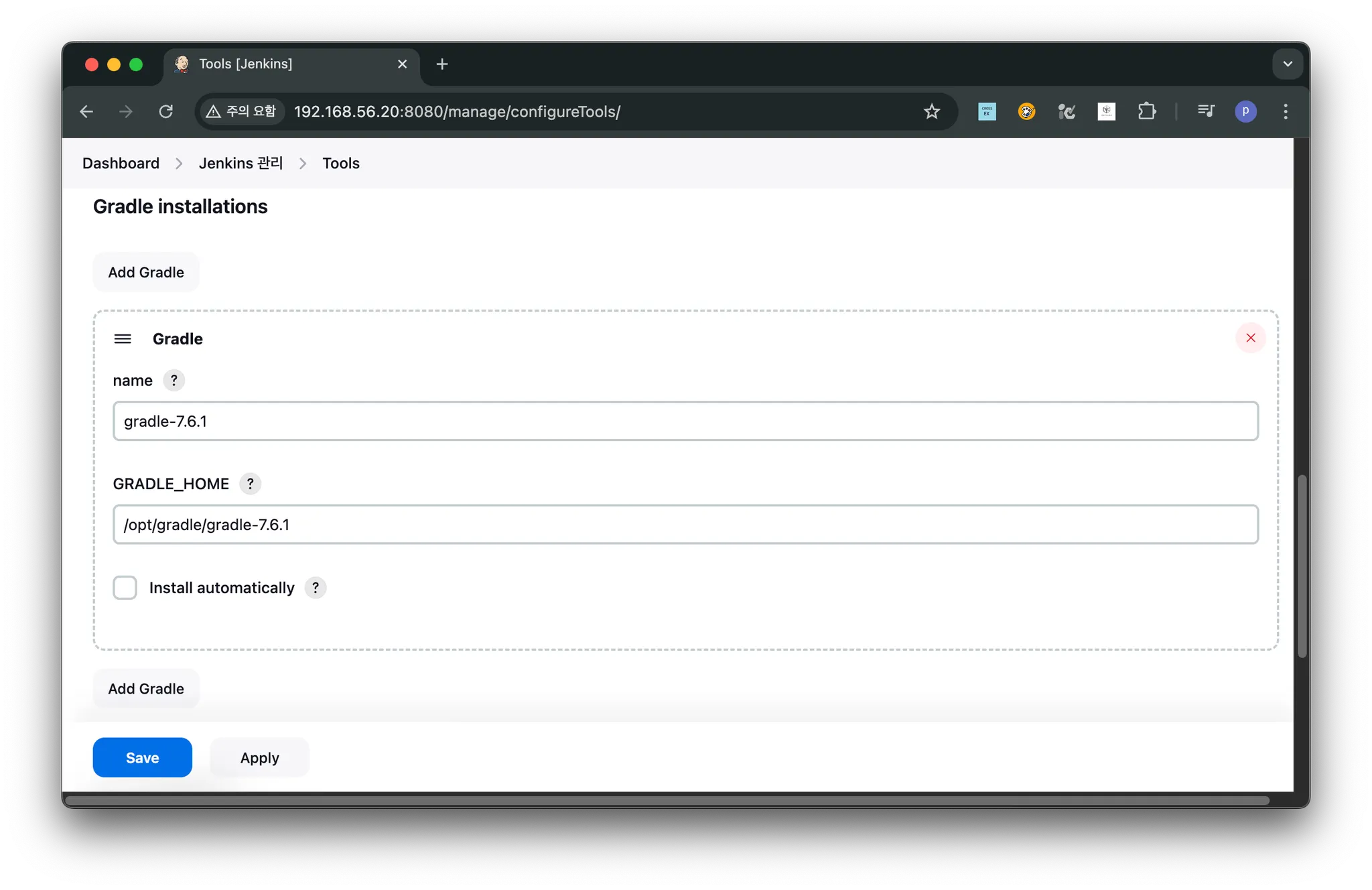 - ์ง์ ์ค์นํ ๋ฒ์ ์ Gradle ์ด๋ OpenJDK ๋ฅผ Jenkins์์ ๋น๋๋ฅผ ํ ๋ ์ฌ์ฉํ๊ฒ ๋ค๊ณ ๋ฑ๋ก